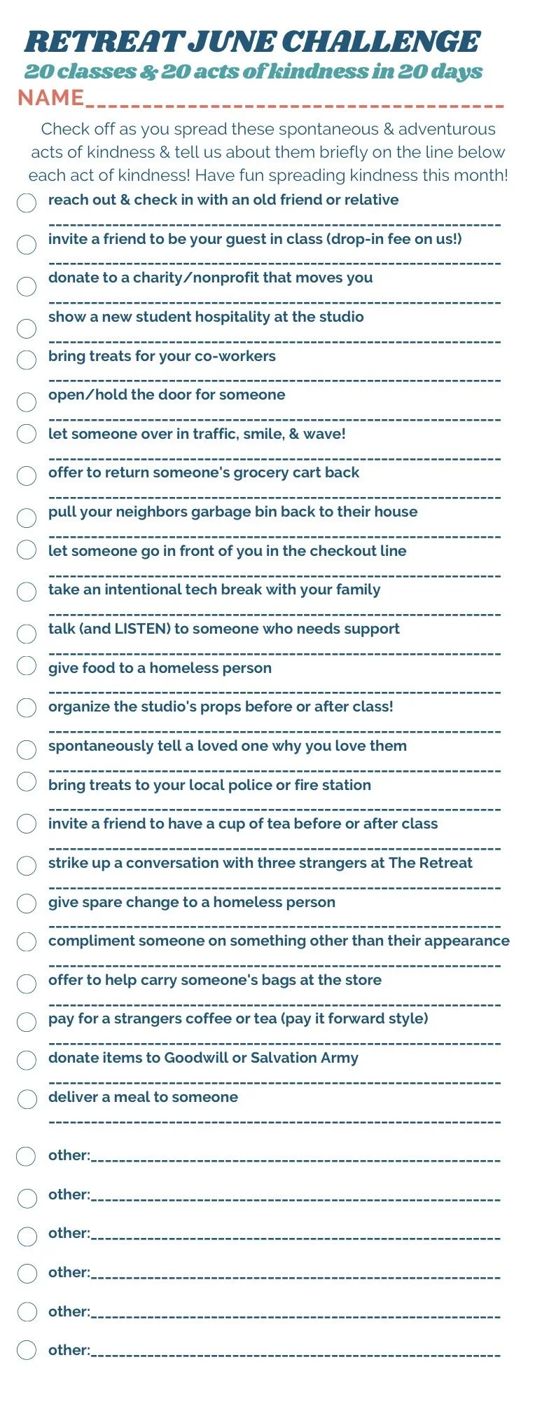 Join our JUNE CHALLENGE to attend 20 Classes and complete 20 Acts of Kindness during the month of June!